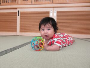 右:腹ばいで遊べるようになったよ。