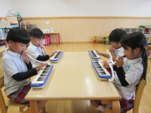 右:鍵盤ハーモニカの練習中!