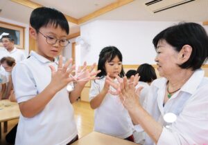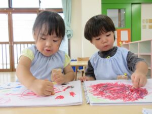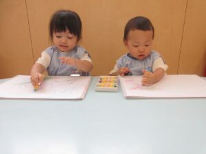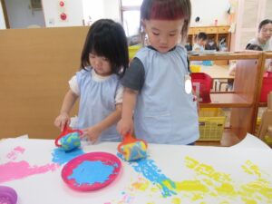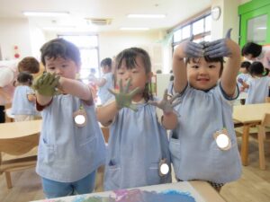 右:絵の具まぜまぜ♪ 手がこんな色になったよ!!